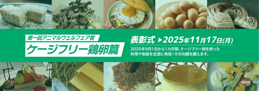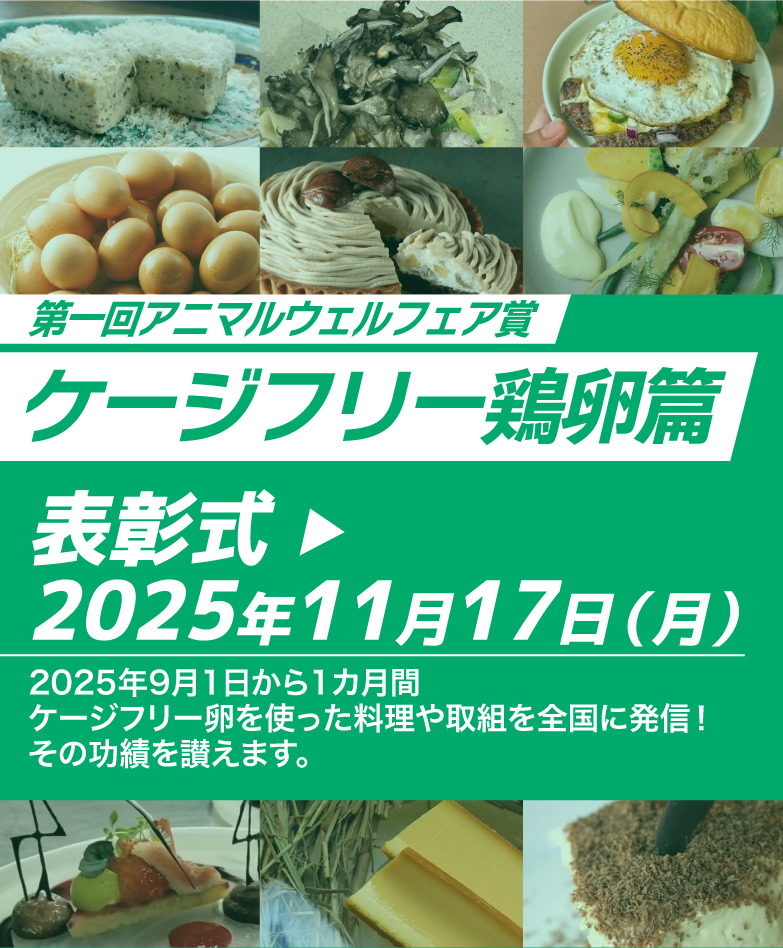 一般社団法人日本サステイナブル・レストラン協会(SRAジャパン)と一般社団法人アニマルウェルフェア・コーポレート・パートナーズ(AWCP)との共催で、飲食店の皆さまと共に進むべく「アニマルウェルフェア賞」を設けました。栄えある第一回は「ケージフリー鶏卵」篇。9月1日から1カ月間、ケージフリー卵を使った料理や取り組みを全国に発信し、11月17日の表彰式でその功績を讃えます。