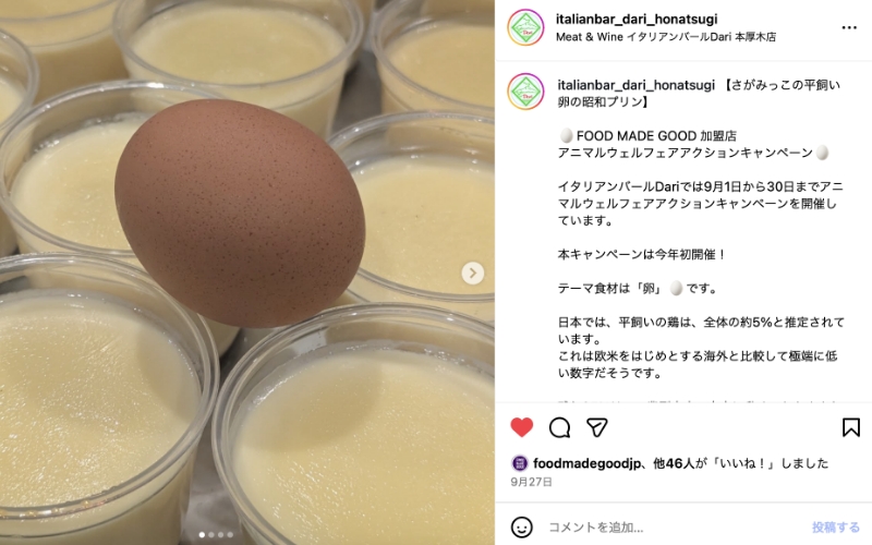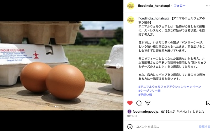 そこでAWCPのケージフリーネット。https://cagefreenet.org/を活用いただき、井上養鶏場(神奈川県相模原市)とつながることができました。「さがみっこ」という、平飼い有精卵のブランド卵を調達しはじめました。キャンペーンに合わせて、この平飼い卵を使って黒トリュフとチーズのオムレツを提供してくださっています。是非、ご賞味ください。