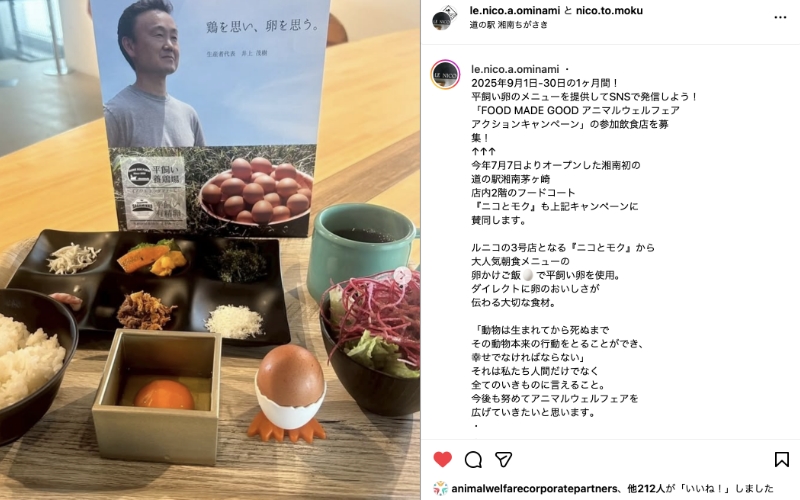 お客様と会話するなかで、アニマルウェルフェアに配慮された卵を食べたいが、家庭で平飼い卵を手に入れるのは難しい。レストランで平飼い卵のメニューがあるときは積極的に選んでいるという方が多いことに気づき、まずは併設する物販のお店で平飼いたまごを販売したところ好評だったとのことです。練馬区からアニマルウェルフェアを広める同店の取り組みをどうぞご支援ください。