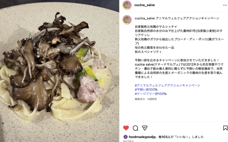 当キャンペーンに参加される以前から平飼いたまごを100%使い続けていらっしゃる坪内シェフは自らが200羽もの鶏を育てていらっしゃいます。「レシピのないレストラン」として、その日・その季節に合わせた料理を提供し、食材の背景や生産者の想いを伝える。是非、クチーナサルヴェさんに足をお運びください。