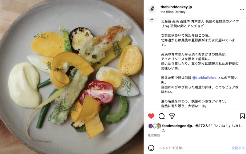 有機的・自然的な農法で育てられた季節の食材からインスピレーションを得たメニューを提供し、地域農家をサポート。農家さんとの信頼関係のもと、直接届けられる新鮮な野菜に添えて提供される卵はもちろん平飼い100%。農と食とアートを軸にしたサステナブルファーム&パーク(クルックフィールズ(千葉県木更津市))から調達されているそうです。同店の取り組みにご注目ください。