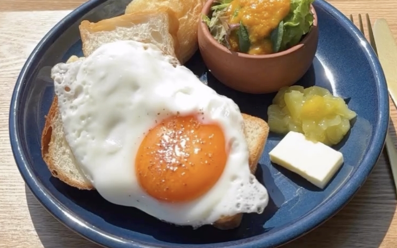 朝食メニューとしてディリーファームの平飼い卵の目玉焼きを提供