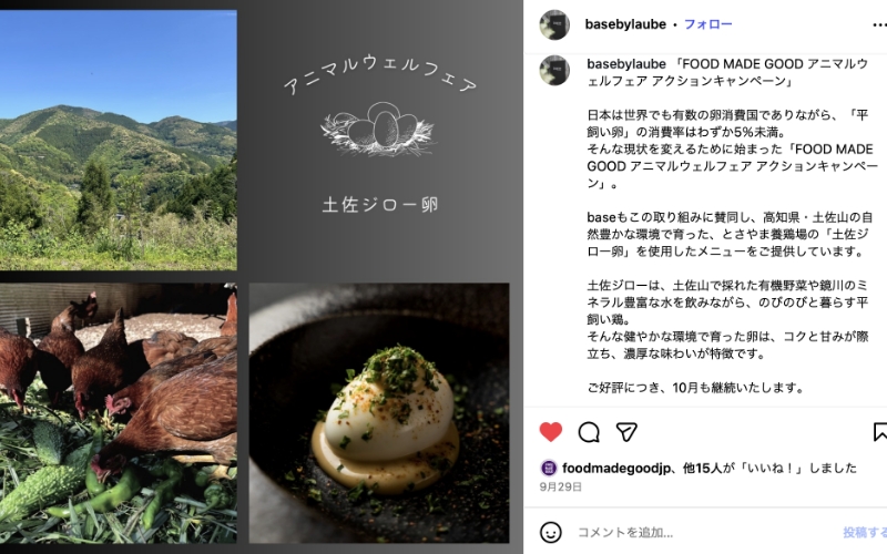 未来の世代に豊かな食文化を残すため、サステナブルな取り組みを重視しており、フードロス削減やフードマイレージの最小化の取り組みにつながっています。同店では、以前より高知県・土佐山の自然豊かな環境で育った、とさやま養鶏場の「土佐ジロー卵」をお使いです。