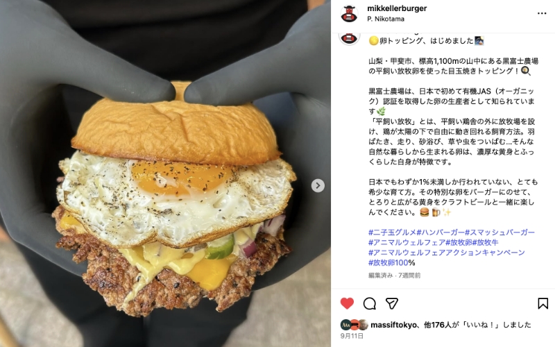 アニマルウェルフェアアクションキャンペーンをきっかけに、「放牧牛×放牧卵」として、平飼い放牧卵の「卵トッピング」が始まりました。山梨・甲斐市、標高1,100mの山中にある黒富士農場の平飼い放牧卵を使った目玉焼きがトッピングできます。黒富士農場は、日本で初めて有機JAS(オーガニック)認証を取得した卵の生産者として知られています。